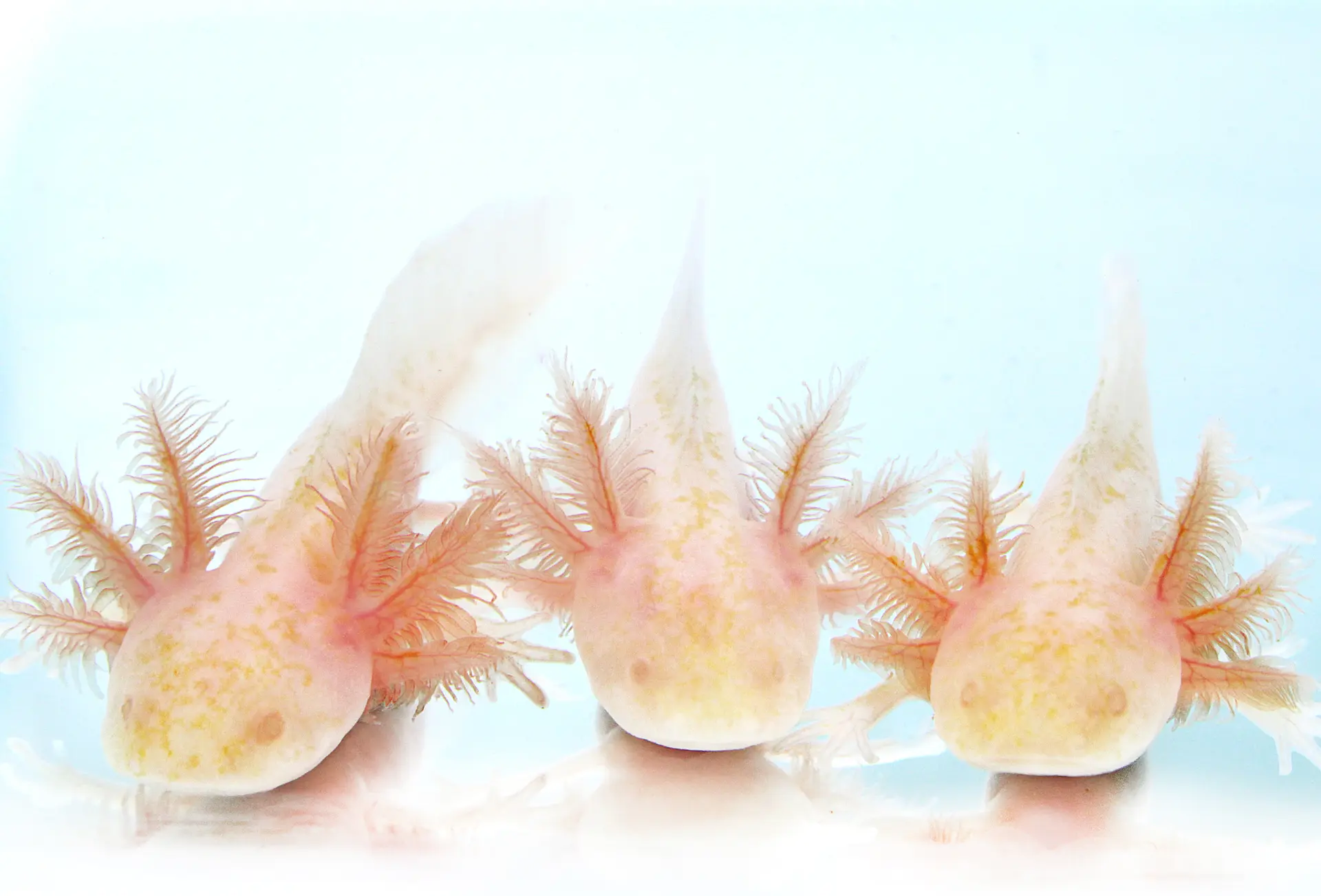 One beautiful popcorn melanoid albino axolotl with fluffy gills. These yellow spotted pink-gilled cuties are so unique and very pretty! Some have iridophores on the gills! Healthy, humanely raised and high quality.