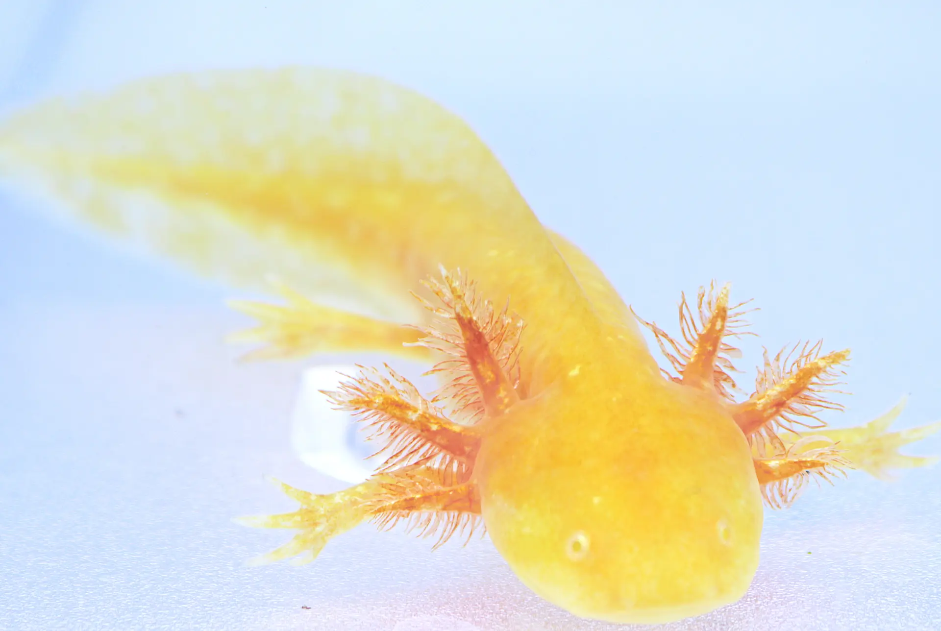 This beautiful deep golden albino has significant iridophores and is GFP. Pictured under aquarium light and blue light. Het copper, melanoid and axanthic. Approximately 5″ in size. Exact lotl pictured.